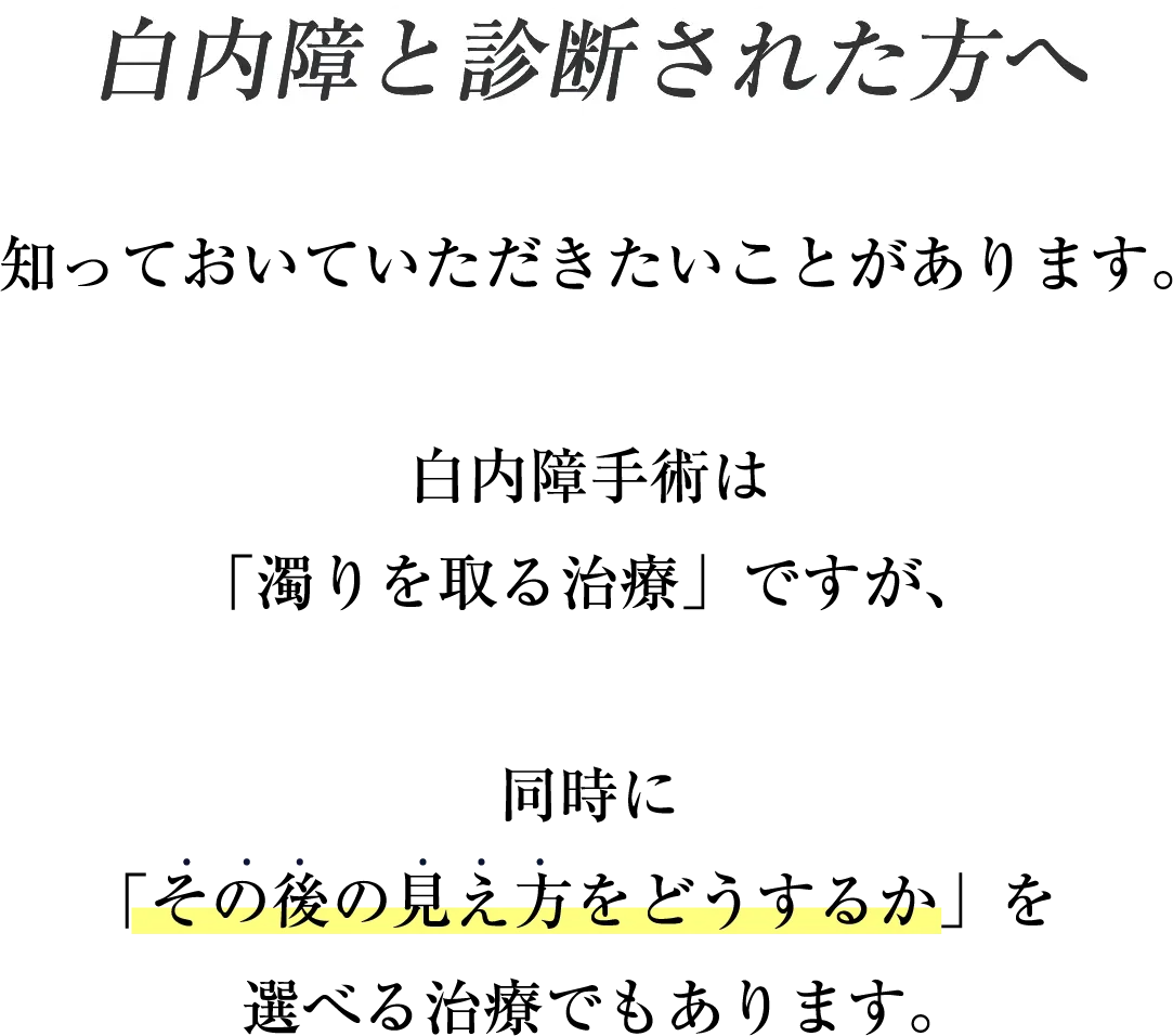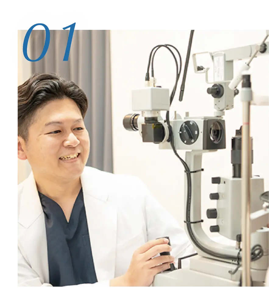 専門性あるドクターが診察から手術まで担当します。 多焦点・単焦点それぞれの特性を理解したうえで、 術後の見え方を見据えた適否判断を行っています。