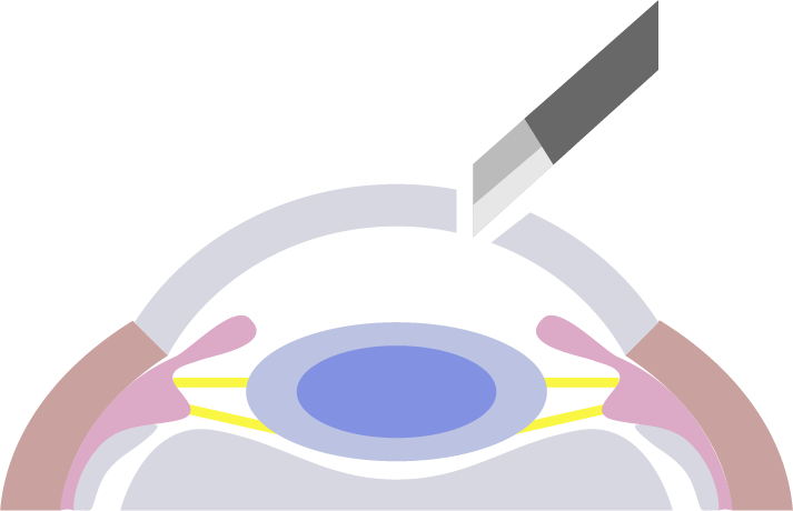 点眼と局所麻酔の後、水晶体を包んでいる袋を切開します。 そこから器械を入 れ、目の中の手術をします。